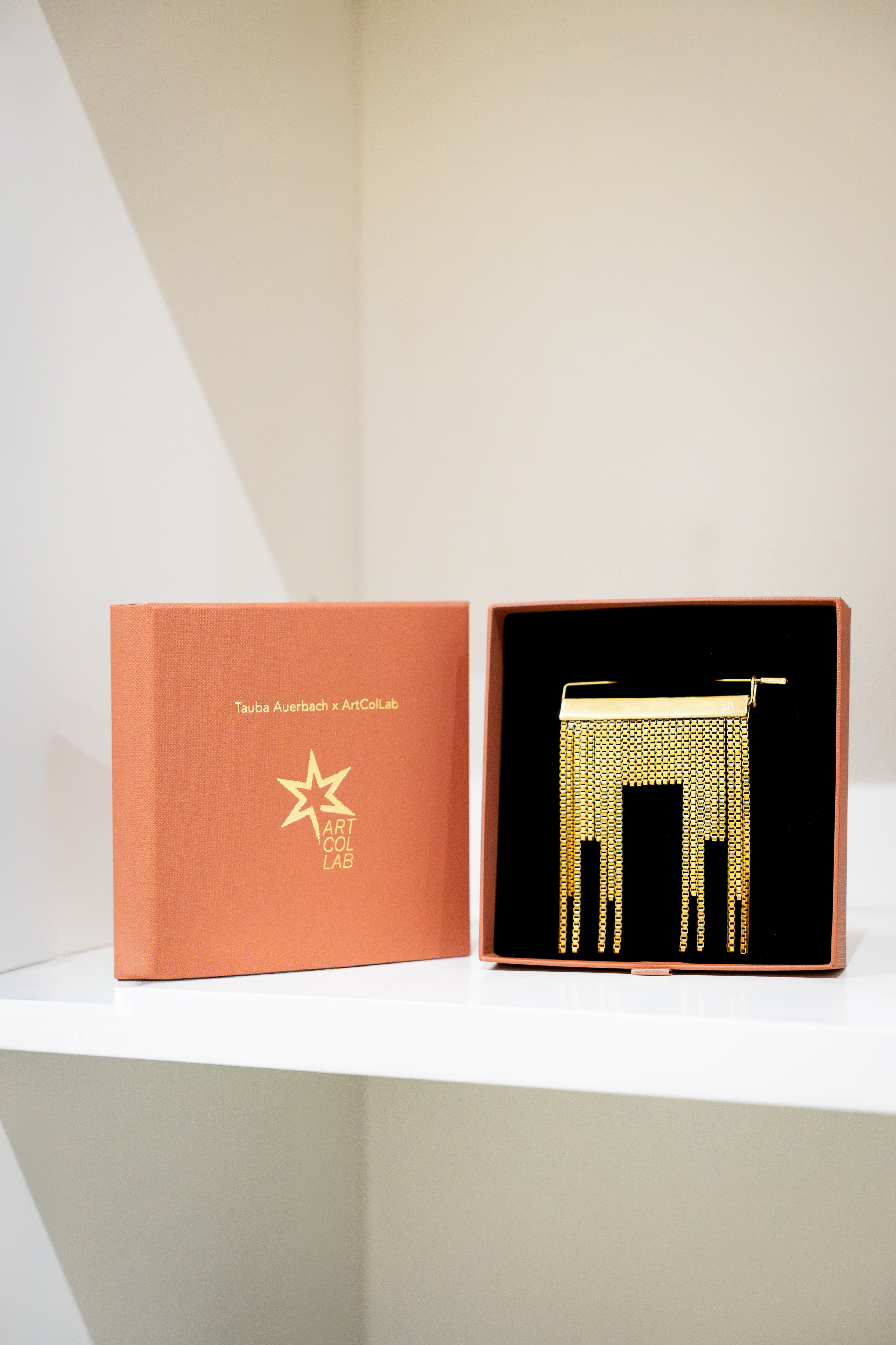 It’s a limited edition piece of 100. Each brooch is numbered and presented in a dedicated box. Handcrafted in brass using the lost-wax casting technique, each chain is individually cut and embellished with a hand-made diamond-bright engraving, then finished with 24-karat gold plating. The piece reflects Auerbach’s exploration of form and material, transforming a sculptural object into a refined collectible work.